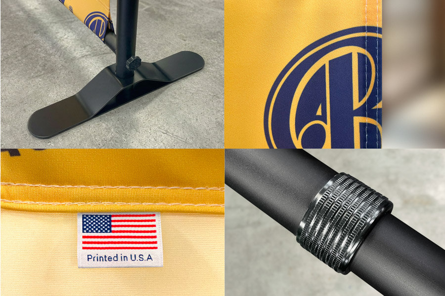 The frame will also be wider than your fabric banner by a minimum of 4.7” (2.3” on each side) due to the width of the vertical posts and the base.
